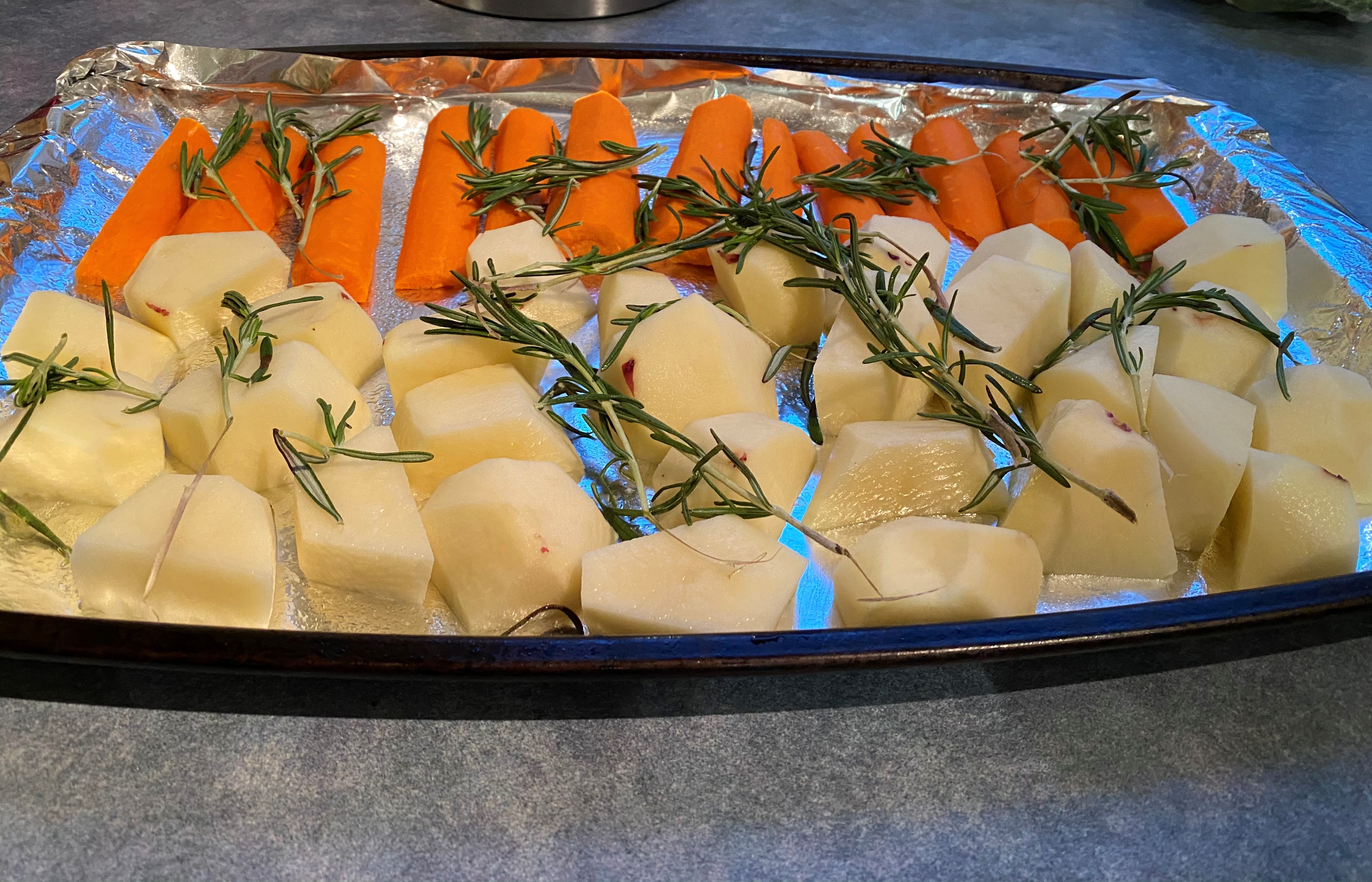 After cleansing potatoes and carrots, pat dry with paper towel (this will help keep them crispy) and chop them in large pieces.
