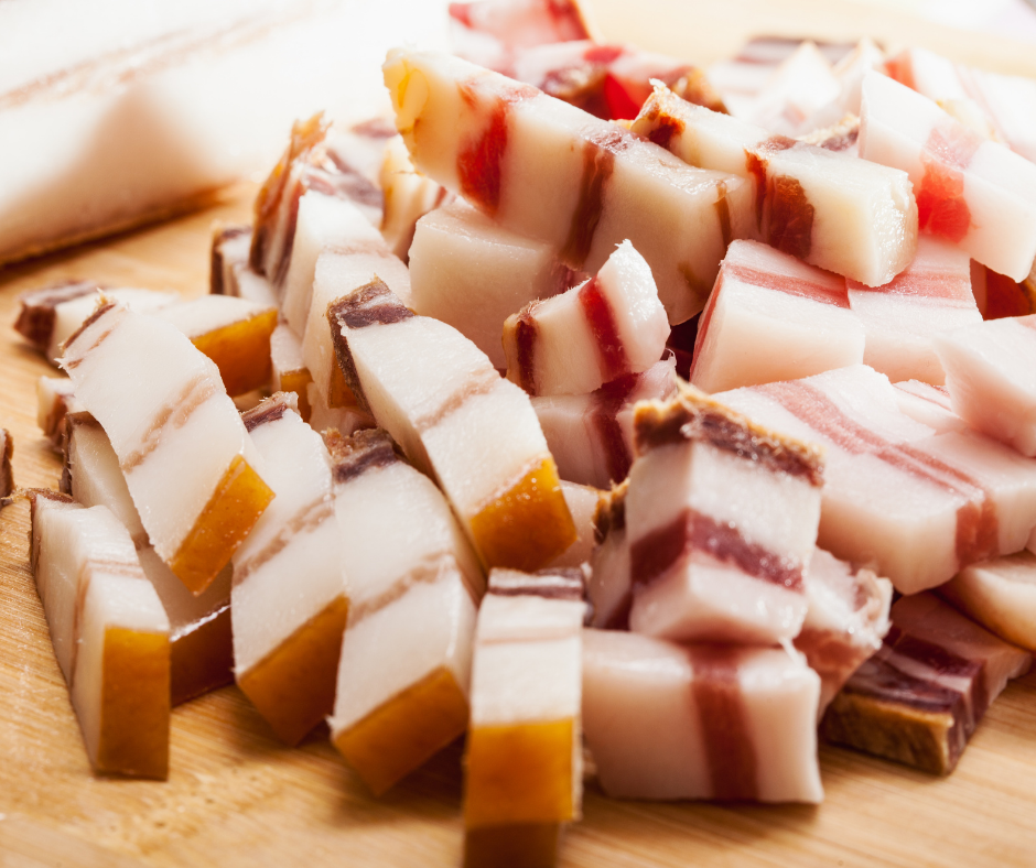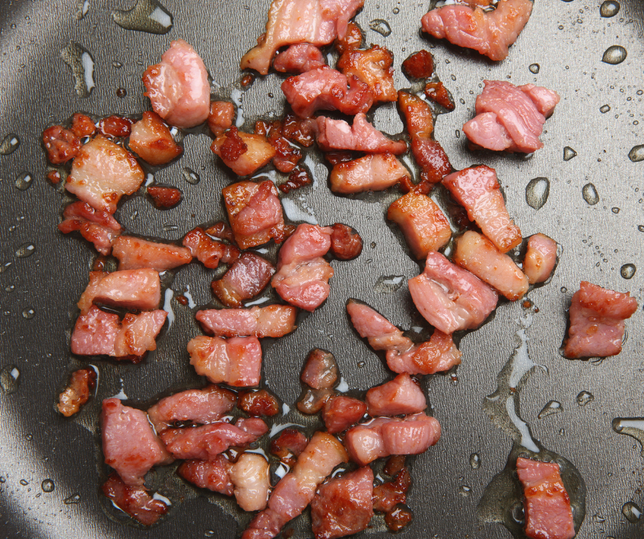 Heat olive oil in a deep skillet over MEDIUM HEAT, and add the pancetta (or bacon) until it is crisp, and fat is rendered. Once it’s rendered, toss in the garlic and cook garlic for 1 minute–enough to soften the garlic if using raw garlic.