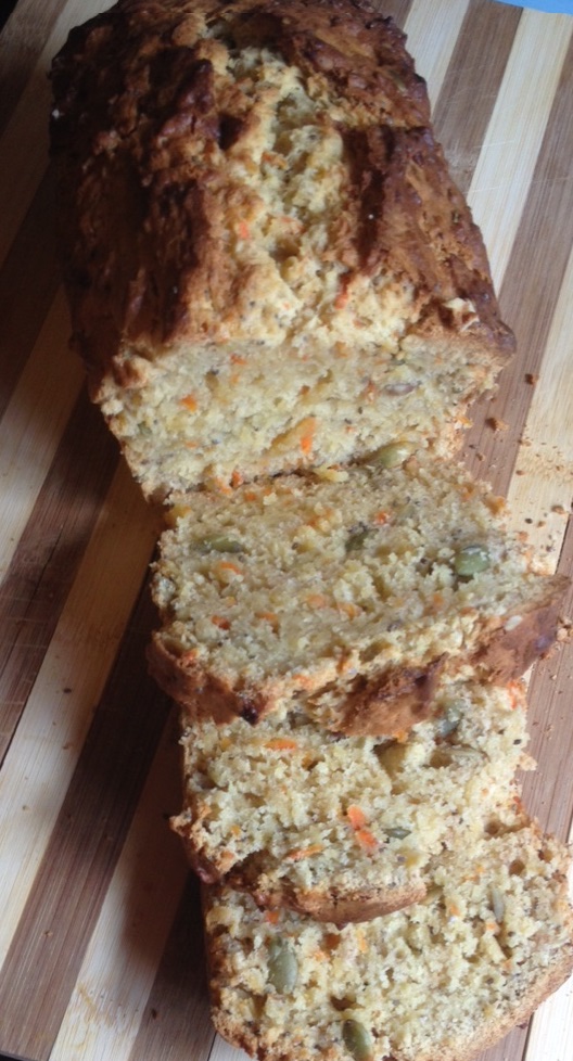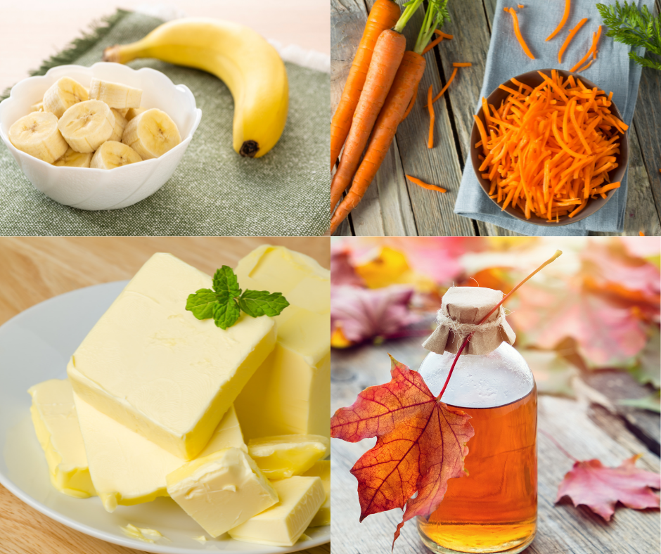 In a large bowl add each of these ingredients one at a time, stirring each time you add the ingredient: mashed bananas, butter, maple syrup, brown sugar, vanilla, eggs, shredded carrots, pumpkin seeds, walnuts. Mix well.