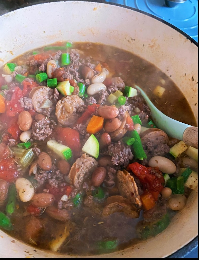 After an hour, add the romano and kidney beans, green beans, and zucchini, stir, and bring to a slight boil. Once boiled, let simmer on low until the vegetables are al dente and beans are cooked through.