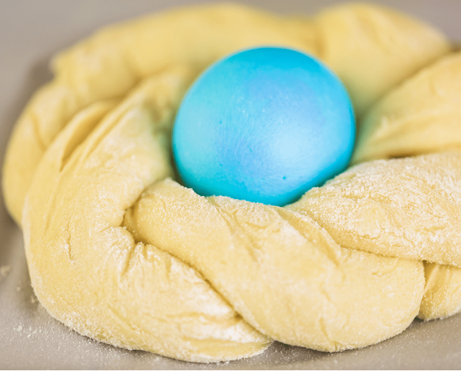 Remove cloth from the dough and in the middle of each bread ring, gently place a colored Easter egg into the center of the bread ring.