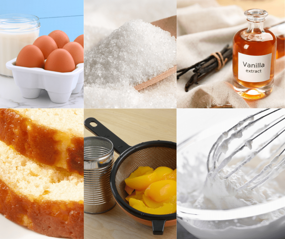 - Pour the peach juice from the can of peaches over the cake, covering them well, then set aside while you make your custard.